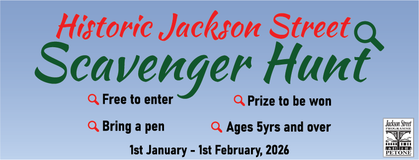 - Historic Jackson Street – Scavenger HuntGrab the family or friends for this fun interactive scavenger hunt and learn about our history at the same time. Did you know that Petone (Pito-one, “end of the sandy beach”) was New Zealand’s first European settlement in 1840, established by the New Zealand Company. Competition runs from the 1st… Read more: Historic Jackson Street – Scavenger Hunt